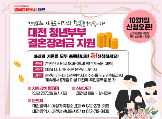 2024년부터 대전시는 결혼을 장려하기 위해, 또 신혼부부의 경제적 부담을 줄이기 위해 다양한 지원금을 도입했습니다. 결혼장려금은 대전에서 결혼하는 만 19세에서 39세 이하의 신혼부부에게 제공되며, 혼인신고를 기준으로 최대 500만 원을 지원합니다. 인당 250만원이 지원됩니다. 이 지원금을 받기 위해서는 혼인신고 전후로 최소 6개월 이상 대전에 거주해야 하며, 1인당 1회에 한정됩니다.